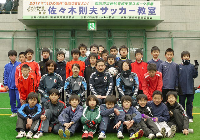 ・今年の「サッカー教室」には講師としてなでしこJAPAN監督の佐々木則夫氏が、2009年以来二度目ですが西条市に来て下さいました。世界のサッカー界の最優秀監督に選ばれるなど、大活躍をされています。またアシスタントとして、ナショナルトレセンコーチ3名が各地区より駆けつけて下さり、“ビバ・スポルティアSAIJO”にて、受講生180名が参加して開催されました。 |